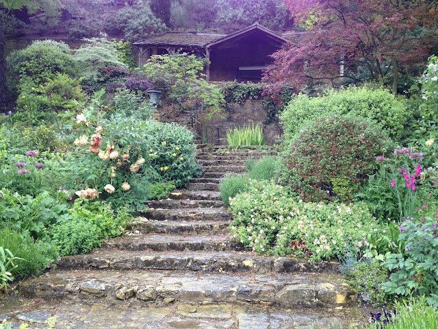 Just as we arrive, the rain starts. Fortunately it only lasted for 30 minutes or so. Then we headed out to a freshly washed garden. This garden is directly next door to Hidcote and is well worth the visit. I had seen this rectangular pool in Gardens Illustrated magazine this past year. The lily leaves above would rain into the fountain. We arrived in this room during a shower and didn't notice the leaves were a fountain until it stopped raining.