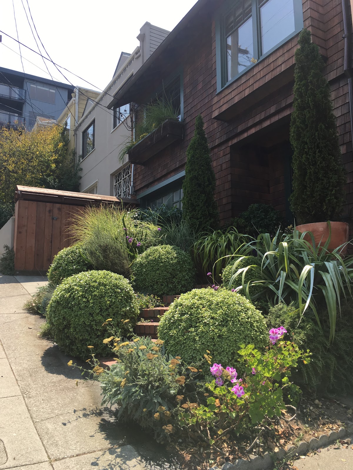 This garden has three different faces or attitudes and all packed into a small 10 x 20 foot space. The five round Pittosporum 'Golf Ball' really hold the mess together and help differentiate the three views.