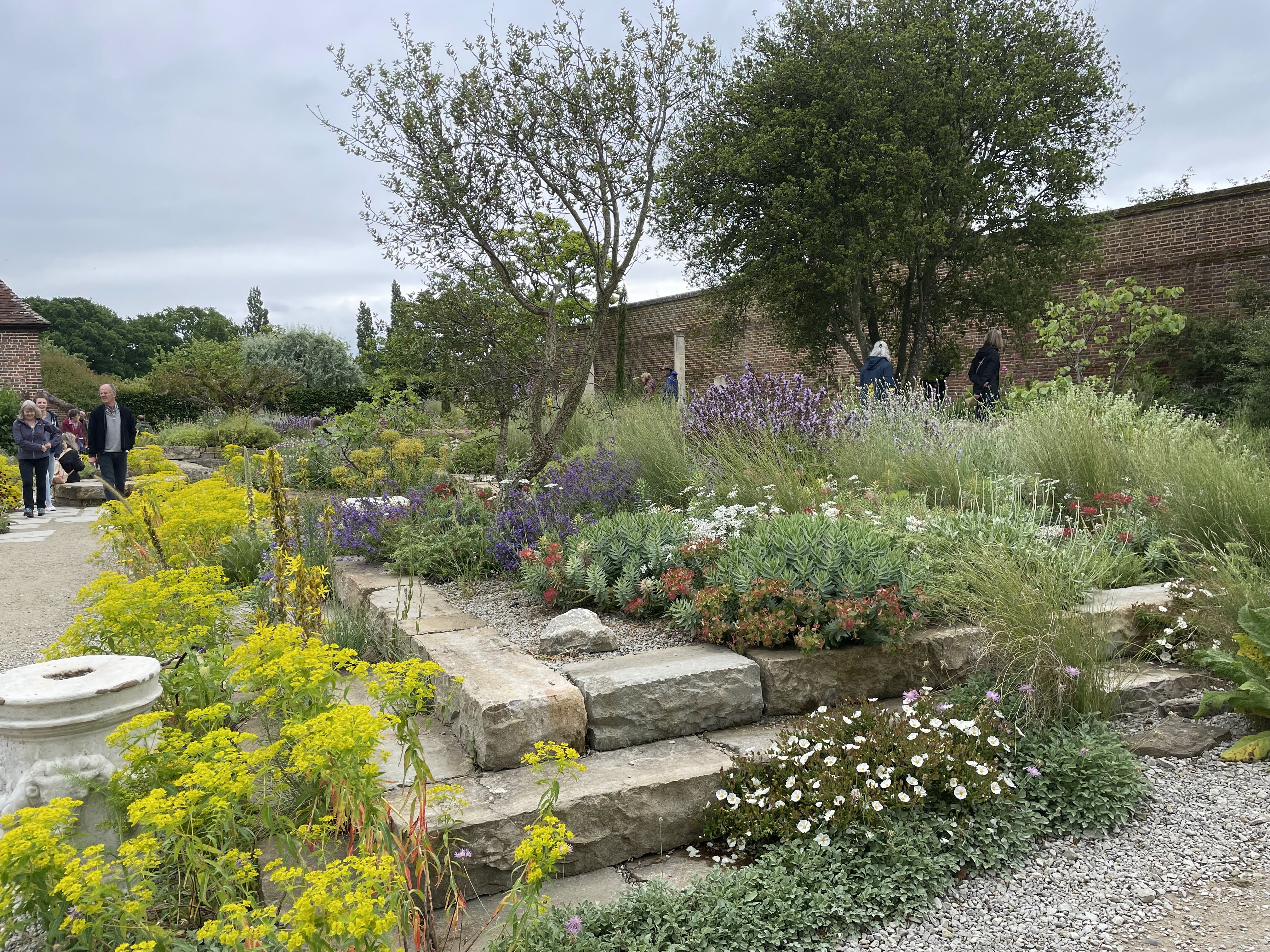 Delos garden Dan Pearson, Dianthus cortunsian or cruentus?, Phlomis, white garden artemisia, absinthium, Allium moly, Luzula nivea, astrantia, evening primrose,