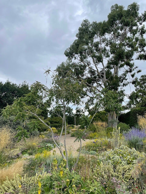 July 31 - Merton Borders delighted my eye with its layers of blue, yellow, chartreuse with dabs of pink. Composed of solidago, eryngium, echinops, mallow, a couple of grasses and tall daisies, this garden was planted in 2011. It has aged extremely well.
